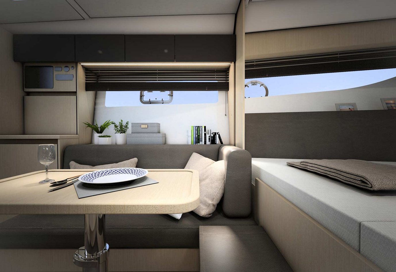 Below deck, the concept of the BAVARIA SR33 offers plenty of light, lots of space, four berths and a cabin plus large saloon. The saloon and the large bed in the forecastle merge into one large space reminiscent of a loft. During the day, the open‐plan concept of the BAVARIA SR33 with its large hull windows and skylight provides plenty of light and a pleasant feeling of space in all weathers. And if all the guests stay overnight, the saloon table can be lowered to create an additional berth, and there is nothing to stop 6 people spending cosy hours below deck.