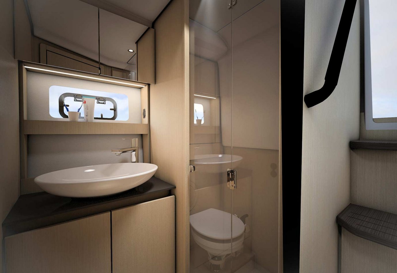 Interior designers recognised decades ago that cooking and enjoying a meal together do not have to take place in two separate rooms. And even though the galley on board the BAVARIA SR33 is still called the wet bar because it is located in the cockpit, it is a complete kitchen with a ceramic hob or optionally with a gas cooker, refrigerator and sink. After all, anyone who cooks wants to be able to talk to their guests while doing so. On the BAVARIA SR33, this is the perfect area for good conversation and enjoyment on board.
