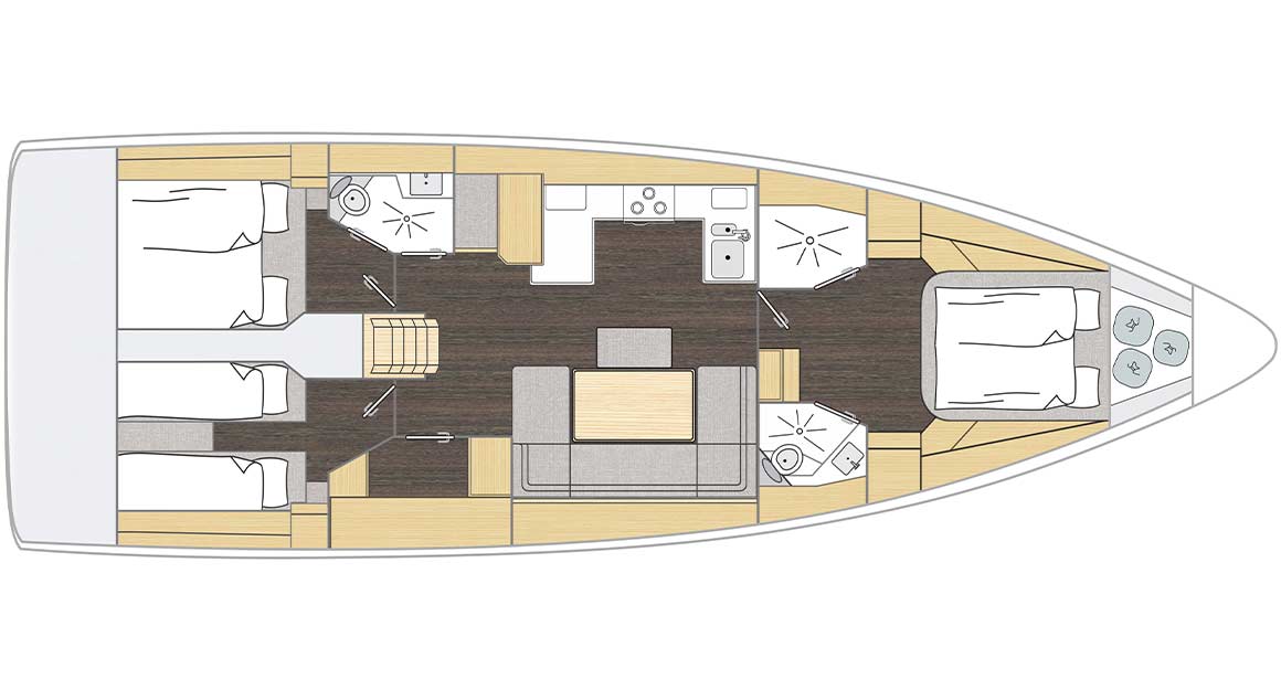 For those who like to sail with a large crew, choose the 5‐cabin version with three bathrooms for maximum privacy for each crew member. For owners who like to have their children and their friends on board, the classic 3‐cabin version with a large owner’s cabin forward, plus a double‐decker cabin for the children’s friends amidships, is the perfect layout. Four cabins, each with its own bathroom, is the best layout choice when travelling with four couples.