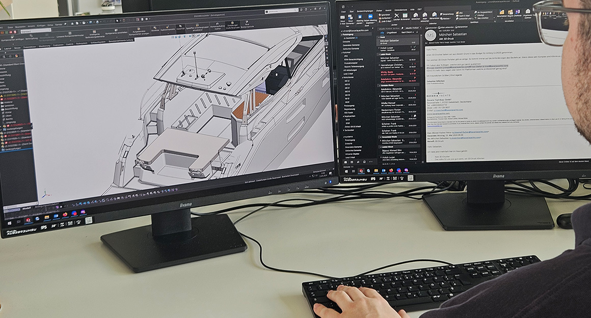 Product development takes place entirely in the CAD system. From individual parts and assemblies to the complete yacht. We accompany the new boat from the first drawing through the construction of the first prototype to the assembly line and series production. During this process, we always check whether any adjustments need to be made in order to guarantee all functions and an efficient construction process.