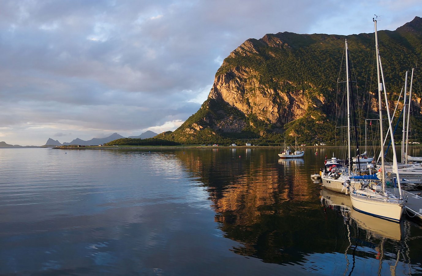 In the evening we found an idyllic little guest harbour in Støtt, 30 miles south of Bodø, where we tied up next to the summer cottage of a nice young couple who even let us taste their delicious fish meal. The place was beautiful, although low‐hanging clouds covered a big part of it. Anyway, it was time to go to sleep, listening to the wind howl in the rigging.