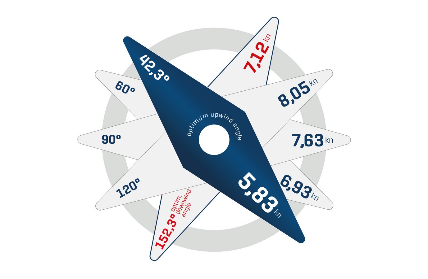 VPP sail performance at 16 kn true wind speed; deep keel 2.02 m.