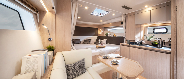 Spending time as a couple or with friends is the main focus in the cockpit. Breakfast, dinner, or a small snack are quickly prepared at the large wet bar including a cooking plate, fridge and sink, and can be served directly at the large cockpit table. Flexible thanks to the fold‐down backrest of the sunbed at the stern, there is space for up to six people.
