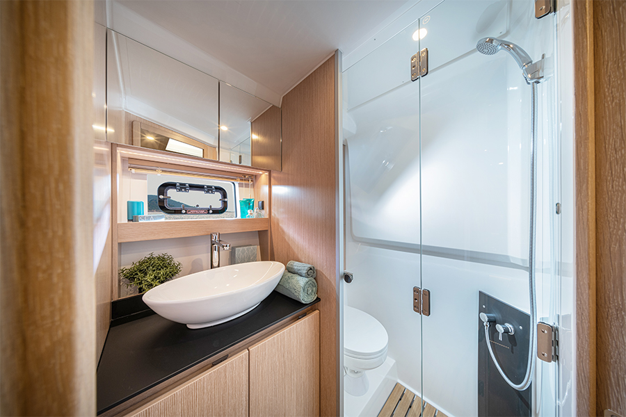 The BAVARIA SR38 adapts to your wishes below deck. The owner's cabin is located midships. There you can decide, whether you prefer sleeping on a large double bed or in separate berths. The conversion is easy. On the 1.90 meter long couch in the owner's cabin you cannot only relax while reading a book, but also use the couch as a third berth. The second double cabin with a large 2.19 x 1.99 meter bed is at the front. This one can either be installed as a closed, separated cabin or in an open layout. The latter has the advantage of a visually larger feeling of space together with the saloon.
