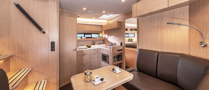 And the lounge sun area at the BAVARIA SR41’s stern has another feature too. The backrests can be folded back, transforming the sunbed into a bench in the cockpit. Perfect for enjoying the breeze gliding past or in the evening as an additional seat for guests at the cockpit table.