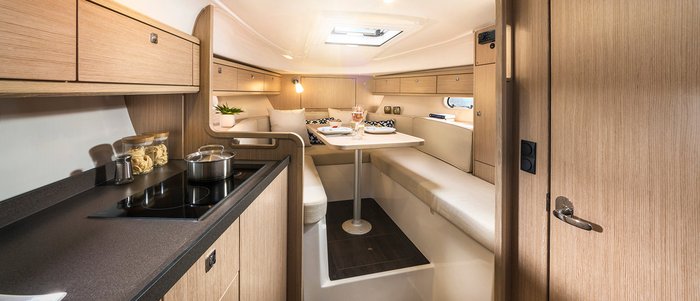 Clever engineering ideas such as automatic ventilation of the engine compartment are a great plus. Added to that is an intelligent layout on deck, in the cockpit and below deck. With the BAVARIA S29, every second on the water is tremendous fun. In every moment. Enjoy her nimble sportiness while you speed over the water and her smart amenities while lying at anchor – such as the bathing platform and the generous space below deck.