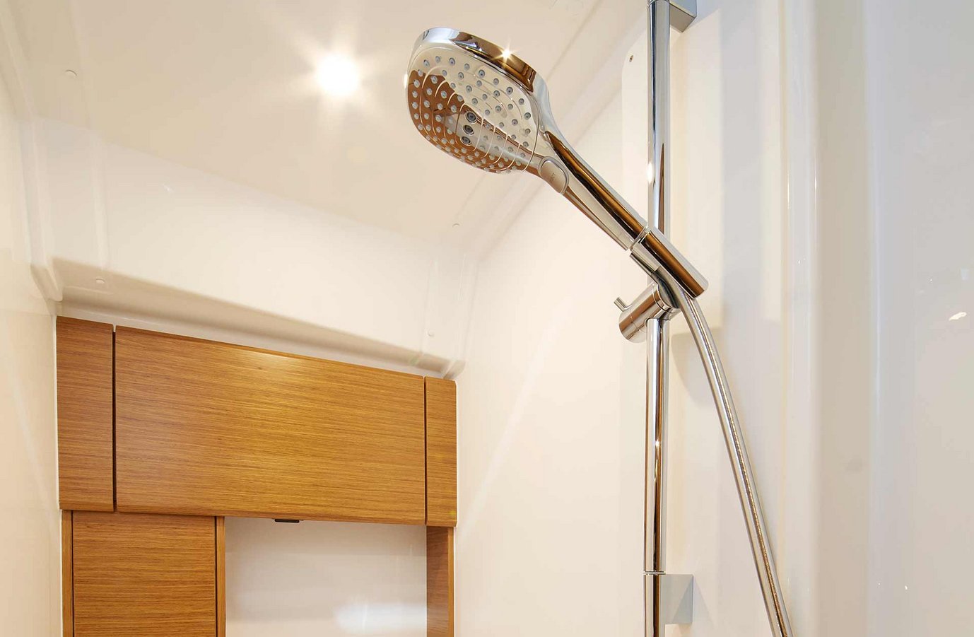 The 2‐cabin version has a large aft cabin with a separate shower.